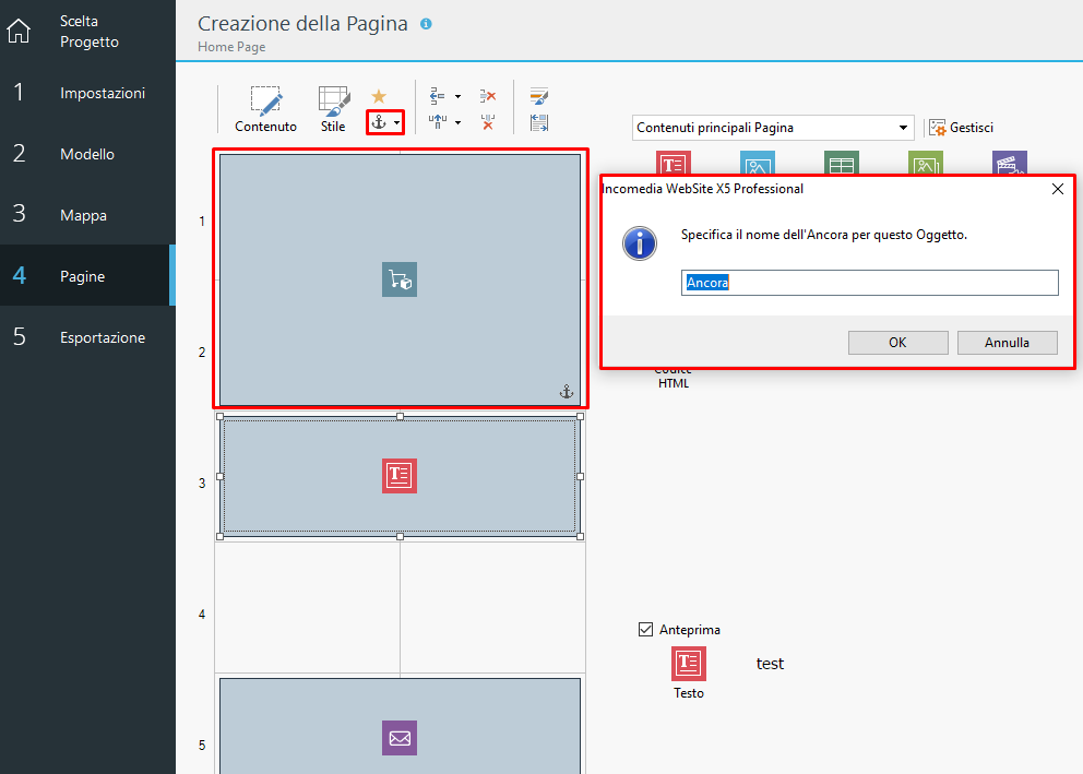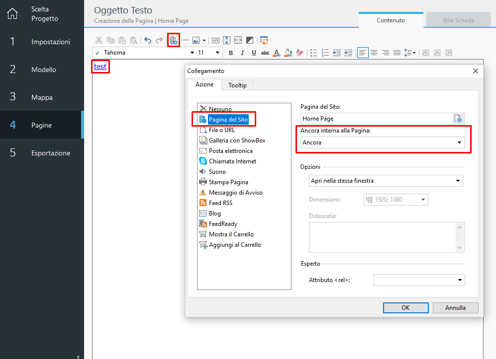 After you named your "anchor", you can open whatever text object for example and add an hyperlink to a certain piece of text. In there, you're gonna tell the software to bring the user to the previous "anchor" when the text is clicked, like shown below