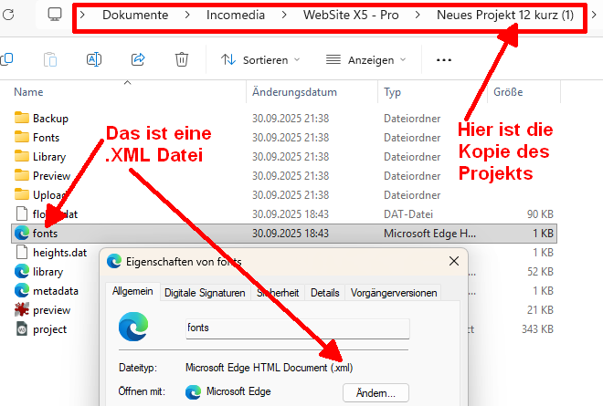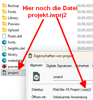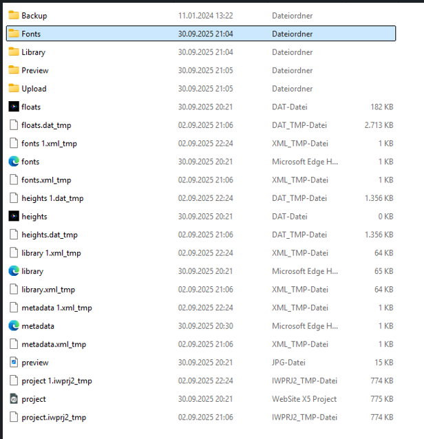 das wollte ich jetzt gerade machen, aber wenn ich meinen Projektordner kopiere, dann finde ich da keine Dateien mit dem Namen fonts.xml, library.xml und project.iwprj2. Die haben alle das _tmp hinten dran. Ich habe dir die Dateiübersicht einmal angehängt.