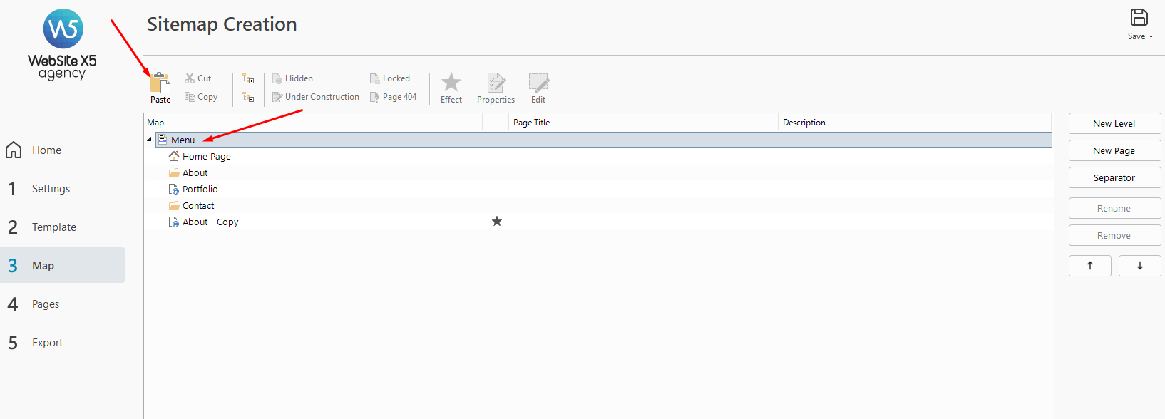 while you have both windows of WebSite X5 open, please make sure so click on Menu an the Paste button should be active.