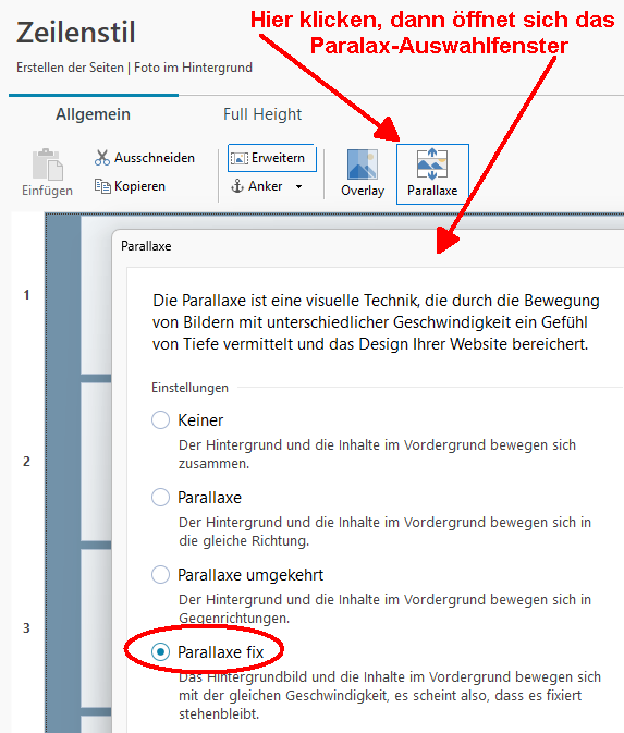 Auf das Symbol "Paralax" klicken, dann öffnet sich ein Auswahlfenster und hier die letzte Auswahl markieren, dann sieht es gut aus und es gibt kein Bildzittern und keine Verzerrungen, siehe auch