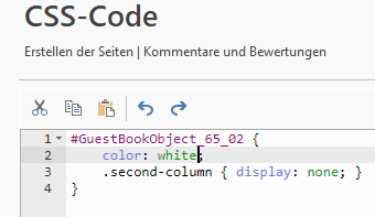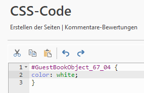 Um die Schriftfarbe zu ändern im Raster das Objekt "Kommentare und Bewertungen" markieren und oben auf "Code" klicken, es öffnet sich das Eingabefeld für den CSS-Code.