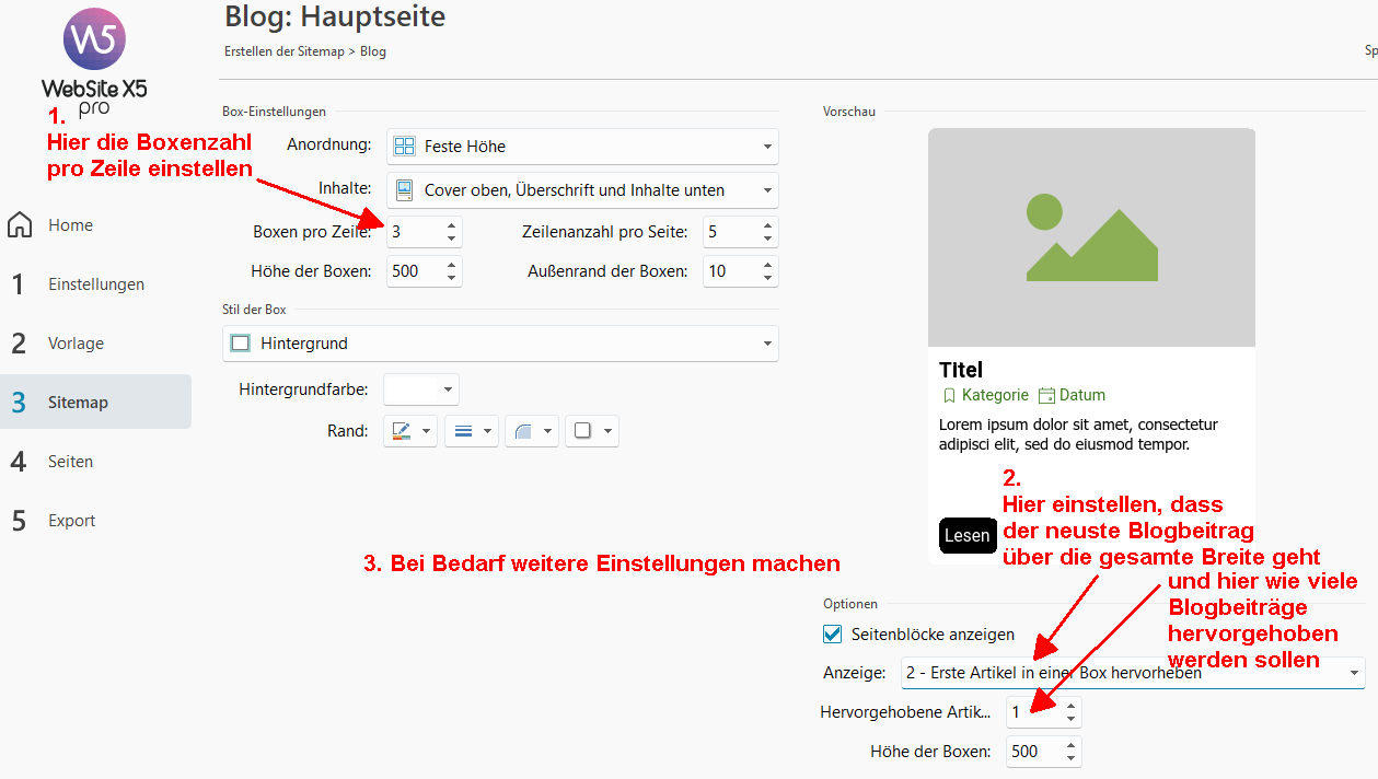 In WebSite X5 unter "3 Sitemap" ganz unten bei Spezialseiten "Blog: Hauptseite" markieren.