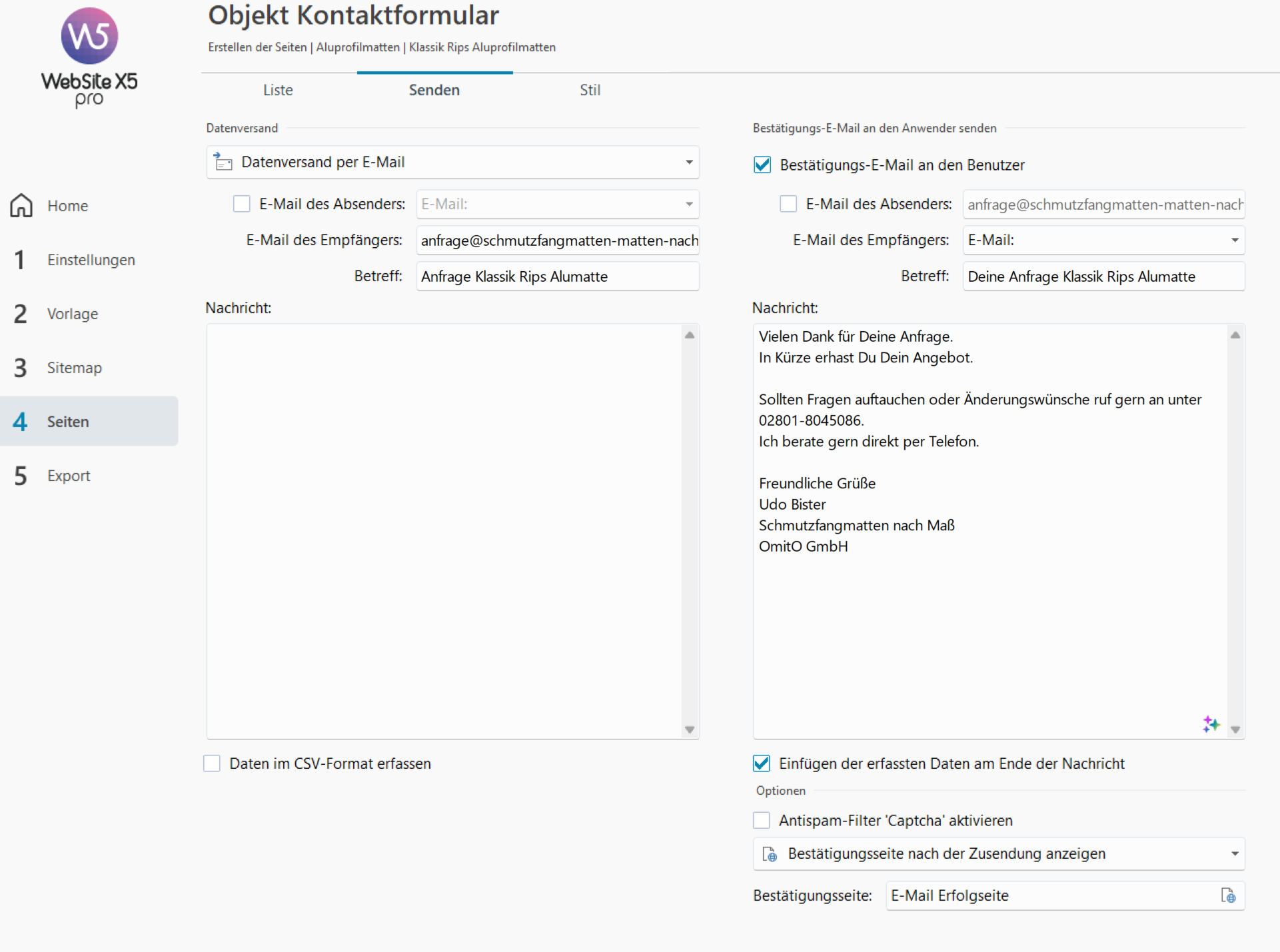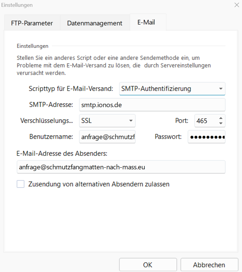 Die Einstellungen zum Versenden und empfangen von E-Mails sind genauso vorgenommen wir die bereits vorhandene Seite https://www.fussmatten-nach-mass.eu