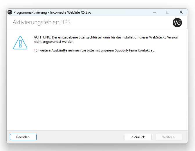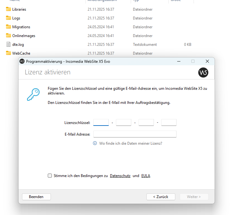 könnten Sie bitte zu C:\Users\Username\AppData\Local\Incomedia\WebSite X5 - Evo\Logs gehen und dort die Datei wsx5lic.log suchen?