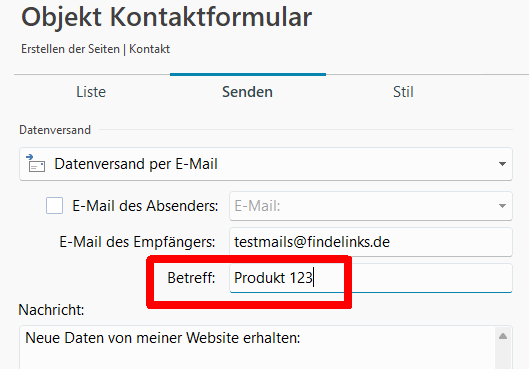 Falls nicht möglich, dann im Objekt "Kontaktformular" im Reiter "Senden" den Button-Text als Betreff eintragen - siehe Screenshot unten - und für jeden Button-Text eine Extra-Seite mit entsprechendem Betreff im Kontaktformular erstellen.