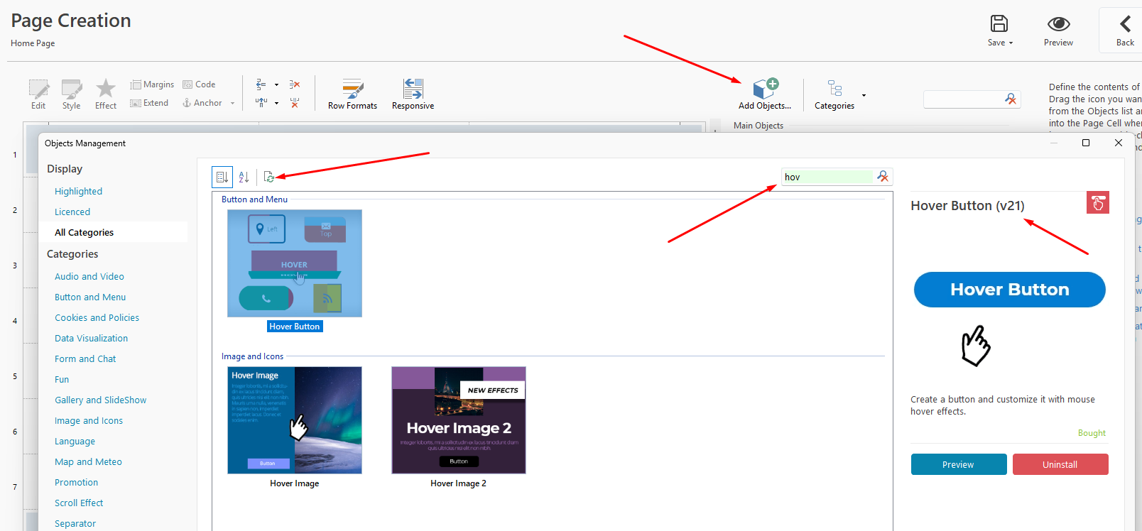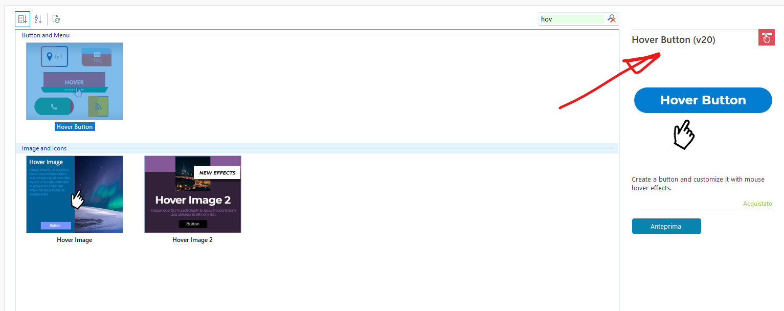 5) Procedi nella gestione oggetti e aggiorna la lista di oggetti, verificando poi Hover Button e la sua versione