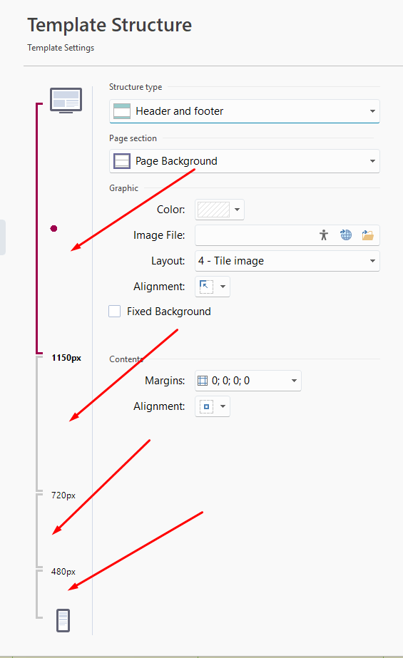 Bitte gehen Sie zu Schritt 2 – Vorlage → Vorlagenstruktur und stellen Sie sicher, dass Sie dieselben Farben auch für die niedrigeren Breakpoints festlegen.