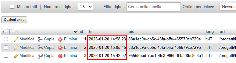 se accedi al tuo database tramite gli strumenti messi a disposizione nel pannello di controllo del tuo spazio web, e visualizzi i contenuti della tabella w5_XXXXX_analytics_visits (XXXXX sarà un ID alfanumerico che designa il tuo progetto, come ad esempio 8hy3vsyn), cosa risulta presente all'interno? Ci sono riferimenti al mese passato?