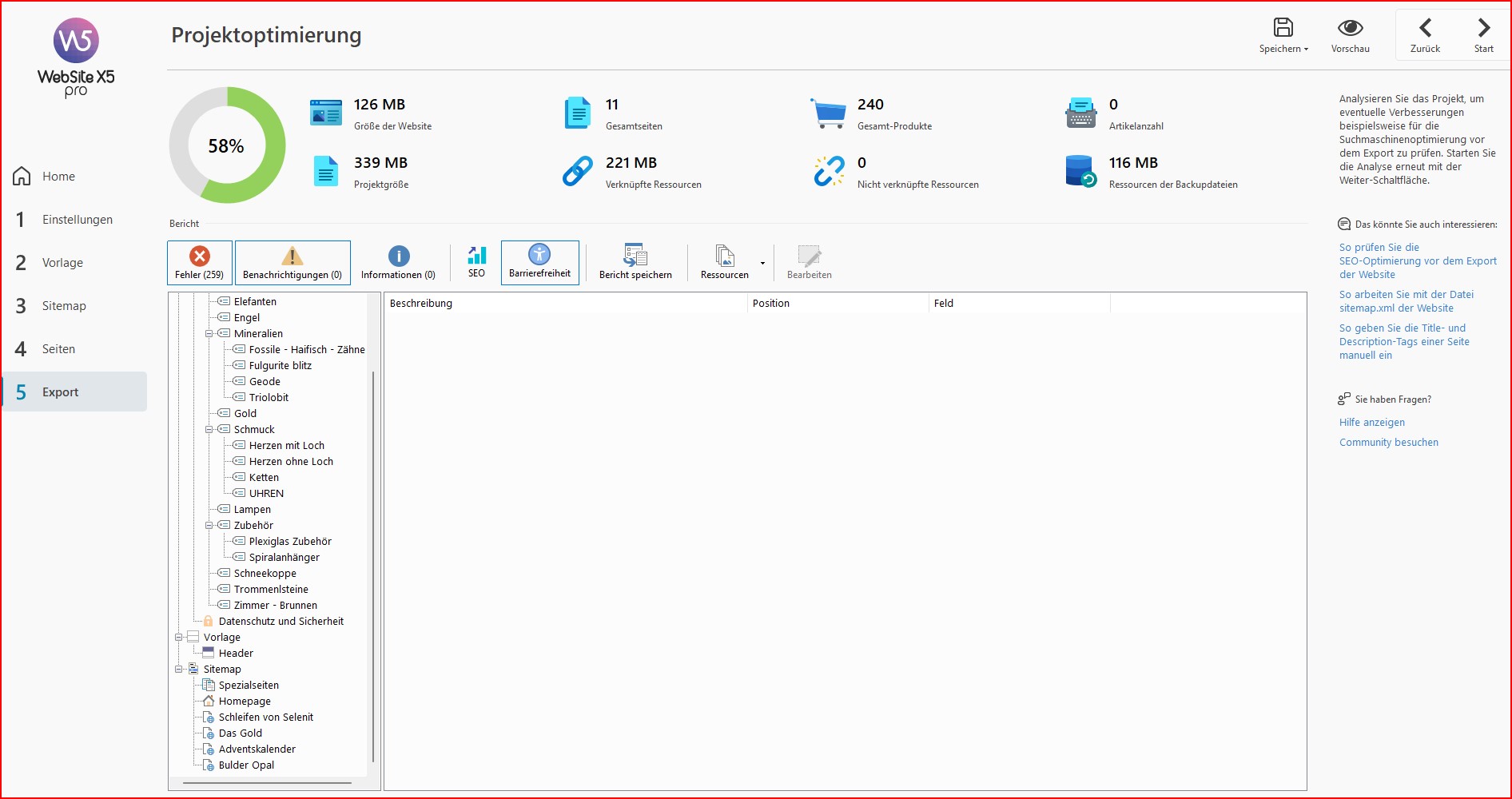 Was die Projektanalyse betrifft, können Sie die Fehler einsehen, indem Sie auf die Seiten an der Seite klicken; auch diese sollten jedoch nicht mit dem von Ihnen geschilderten Problem zusammenhängen.