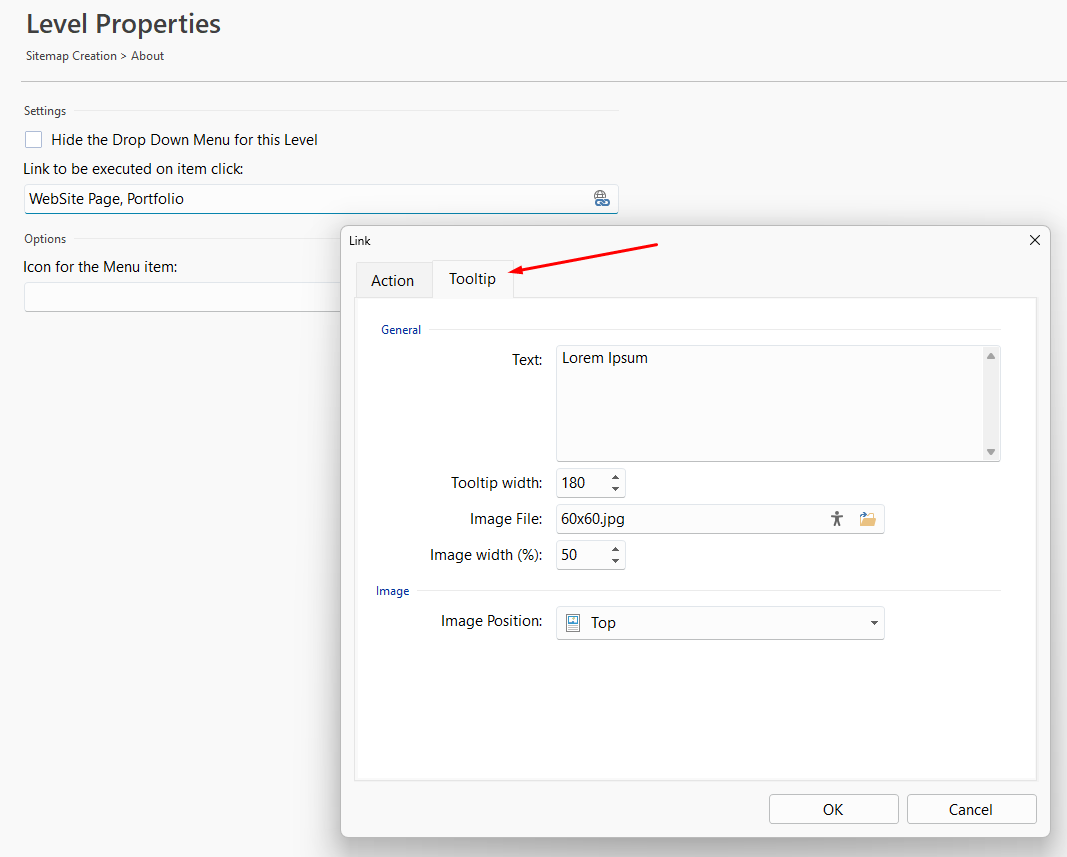 please check the Properties for Aktuelles, in the Link settings there is a tab for the Tooltip settings, where you should find the image and text to be removed.