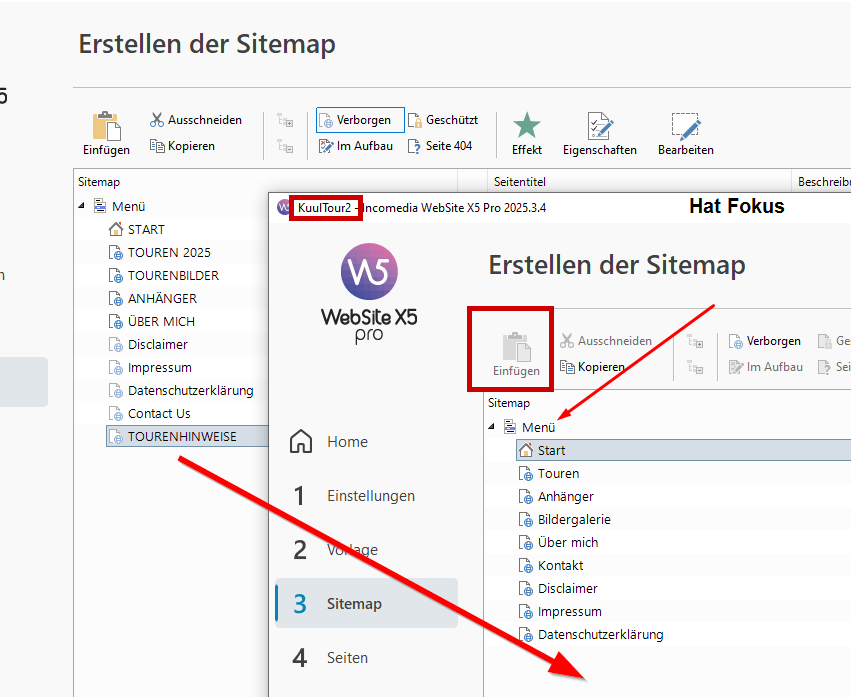 Sie sollten zwei Instanzen von WebSite X5 geöffnet halten, jeweils mit den unterschiedlichen Projekten.