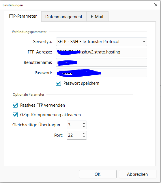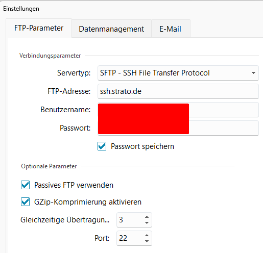 Bei meinem Bruder sehen die FTP-Parameter etwas anders aus, möglicherweise hängt das vom verwendeten Webhostingpaket ab. Wenn es funktioniert, dann würde ich da nichts ändern.