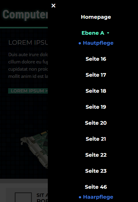 JA, beim mobilen Menü gefällt mir das mit den Ebenen. Es überlagert jede Ebene die vorige von links. Bei WSX5 wird es wie eine Ziehharmonika nach unten geöffnet.