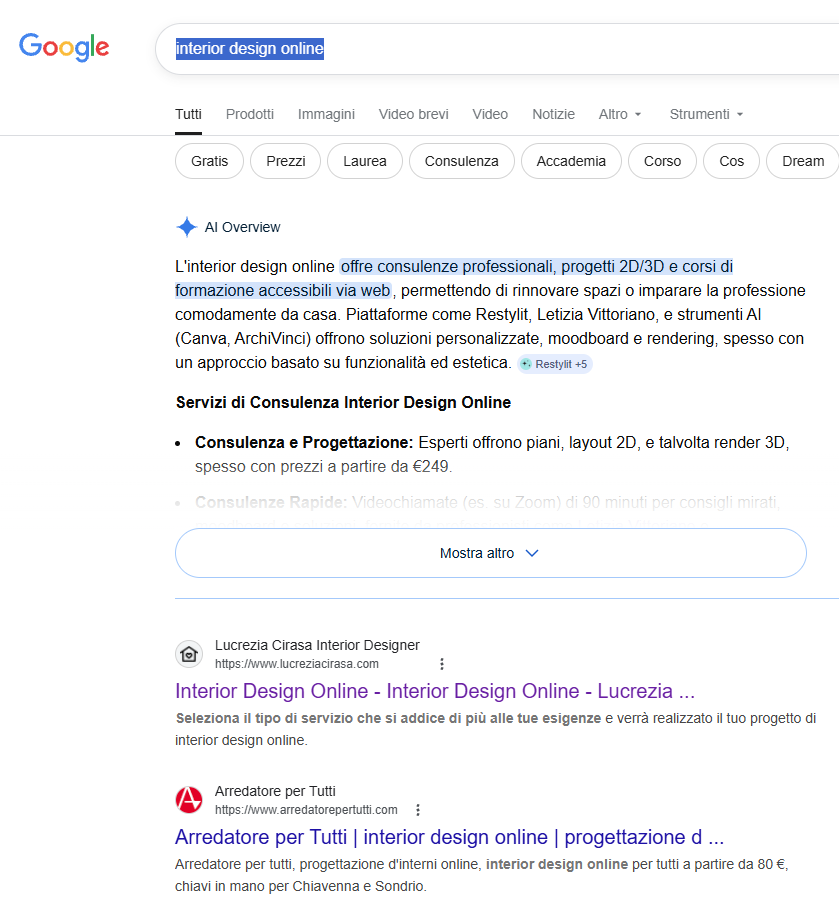 Il problema è che se cerco "interior design online" oppure "interior designer online" il sito è invisibile. Fino a qualche giorno fa era primo sui motori di ricerca