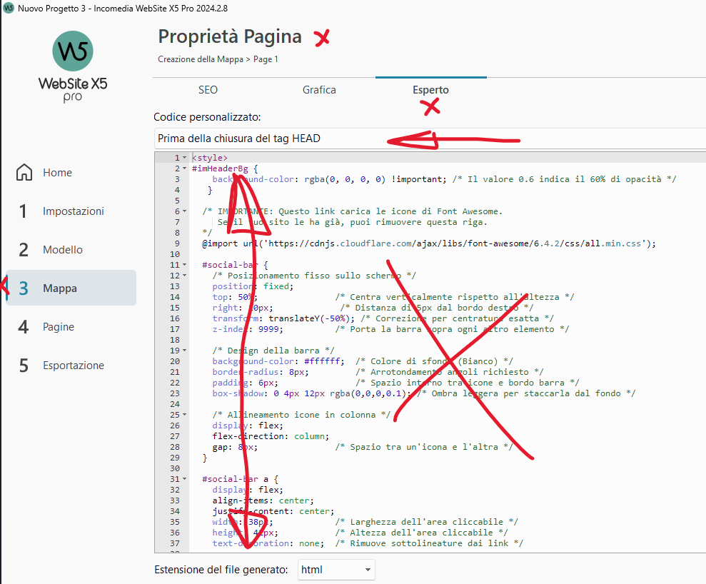 ... il tag <style> invece può essere inserito nella sezione Esperto > HEAD (3ª opzione), ma non è obbligatorio: può anche funzionare in base alla priorità determinata dalla posizione nella pagina...