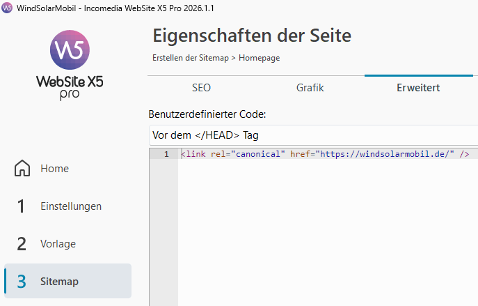 In WebSite X5, select the homepage under "3 Sitemap" and click on "Properties" at the top, then click on the "Expert" tab.