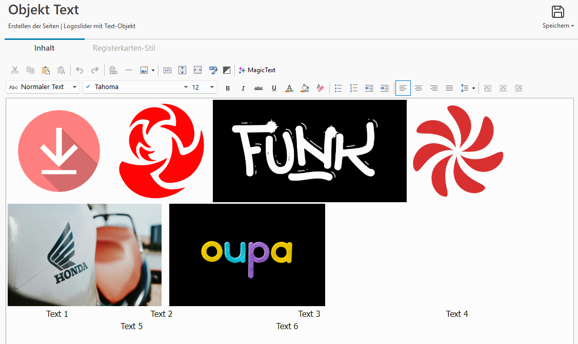Ich habe mein Beispiel 2 vereinfacht, die Bilder bzw. Logos sind jetzt ohne Textbeschriftung, da die Beschriftung einfach als Text (bei Bedarf auch verlinkt) im Text-Objekt eingfügt wird, siehe
