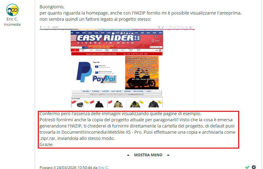 Potresti fornirmi anche la copia del progetto attuale per paragonarli? Visto che la cosa è emersa generandone l'IWZIP, ti chiederei di fornirmi direttamente la cartella del progetto, di default puoi trovarla in Documenti\Incomedia\WebSite X5 - Pro. Puoi effettuarne una copia e archiviarla come .zip/.rar, inviandola allo stesso modo.
