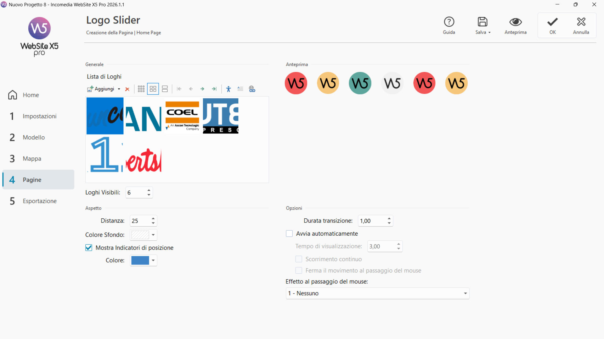 1) Inserisco un oggetto Logo Slider in un progetto vuoto, inserisco 5 icone di loghi qualsiasi e setto le impostazioni in questo modo:
