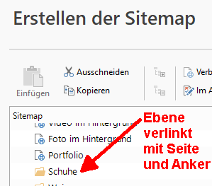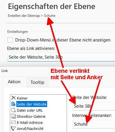 Eine Ebene lässt sich mit einer Seite und dem Anker verlinken - noch nicht getestet.