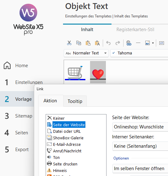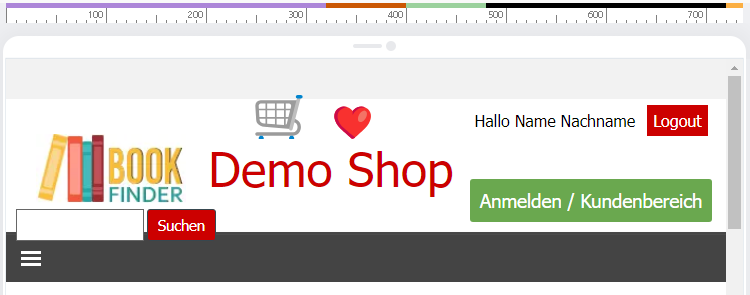 In meinem Demo Shop sind im Header 2 HTML-Symbole (Warenkorb und Herz) im Objekt "Text" verlinkt mit der Warenkorb-Adresse (siehe Beispiel oben) und der Wunschliste (siehe Anleitung 2).