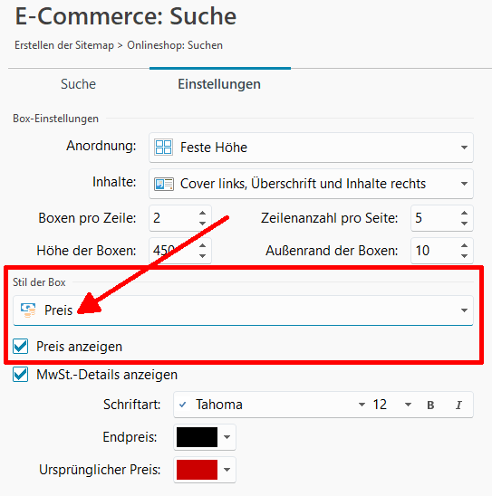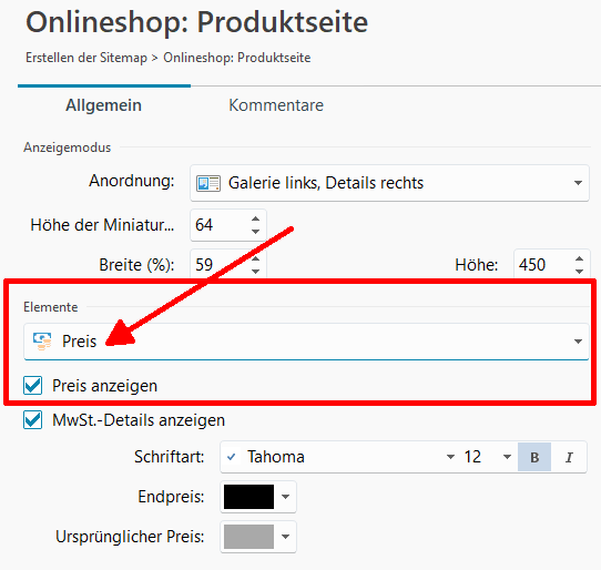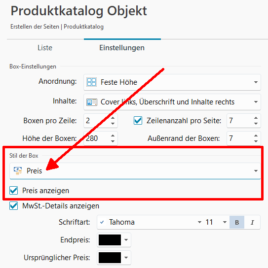 Und hier die Einstellungen für den Preis beim Objekt "Produktkatalog", siehe