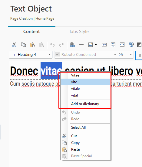 Hello Eric, Thanks for the comment. For all words underlined in red in text objects, no spelling option appears in the context menu when right-clicking: