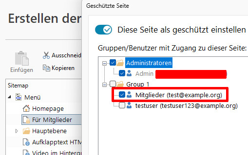 (Mailadresse kann auch fiktiv sein) Als Startseite die geschützte Seite auswählen.