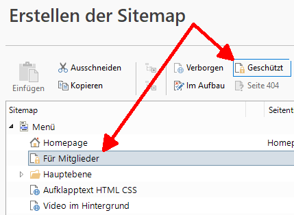 3) In der Sitemap die zu schützende Seite markieren und oben auf "Geschützt" klicken.