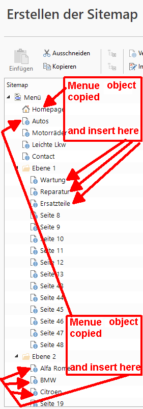 The first 4 links in the menu are linked to pages that have a menu object at the beginning, for each of which a different level has been selected.