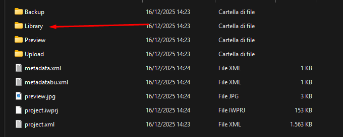 entrato nella cartella corrispondente al progetto da ripristinare ed eliminato (quasi) tutti i file presenti tranne "backup.iwprj", rinomina infine il file "backup.iwprj" in "project.iwprj".