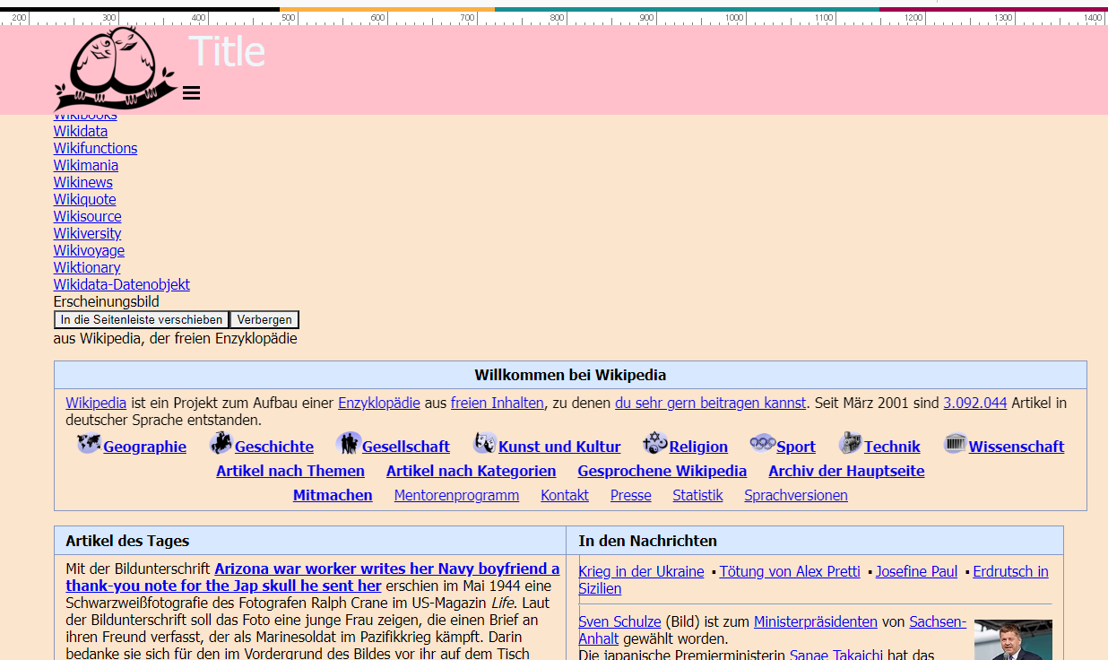 <!DOCTYPE html><html class="client-nojs vector-feature-language-in-header-enabled vector-feature-language-in-main-page-header-disabled vector-feature-page-tools-pinned-disabled vector-feature-toc-pinned-clientpref-1 vector-feature-main-menu-pinned-disabled vector-feature-limited-width-clientpref-1 vector-feature-limited-width-content-disabled vector-feature-custom-font-size-clientpref-1 vector-feature-appearance-pinned-clientpref-1 skin-theme-clientpref-day vector-sticky-header-enabled vector-toc-not-available" lang="de" dir="ltr"><head><meta charset="UTF-8"><title>Wikipedia – Die freie Enzyklopädie</title><script>(function(){var className="client-js vector-feature-language-in-header-enabled vector-feature-language-in-main-page-header-disabled vector-feature-page-tools-pinned-disabled vector-feature-toc-pinned-clientpref-1 vector-feature-main-menu-pinned-disabled vector-feature-limited-width-clientpref-1 vector-feature-limited-width-content-disabled vector-feature-custom-font-size-clientpref-1 vector-feature-appearance-pinned-clientpref-1 skin-theme-clientpref-day vector-sticky-header-enabled vector-toc-not-available";var cookie=document.cookie.match(/(?:^|; )dewikimwclientpreferences=([^;]+)/);if(cookie){cookie[1].split('%2C').forEach(function(pref){className=className.replace(new RegExp('(^| )'+pref.replace(/-clientpref-\w+$|[^\w-]+/g,'')+'-clientpref-\\w+( |$)'),'$1'+pref+'$2');});}document.documentElement.className=className;}());RLCONF={"wgBreakFrames":false,"wgSeparatorTransformTable":[",\t.",".\t,"],"wgDigitTransformTable":["",""],"wgDefaultDateFormat":"dmy","wgMonthNames":["","Januar","Februar","März","April","Mai","Juni","Juli","August","September","Oktober","November","Dezember"],"wgRequestId":"8d2f70d6-8a88-4e10-a93b-99c6ca25bdc2","wgCanonicalNamespace":"Project","wgCanonicalSpecialPageName":false,"wgNamespaceNumber":4,"wgPageName":"Wikipedia:Hauptseite","wgTitle":"Hauptseite","wgCurRevisionId":247114458,"wgRevisionId":247114458,"wgArticleId":5248757,"wgIsArticle":true,"wgIsRedirect":false,"wgAction":"view","wgUserName":null,"wgUserGroups":["*"],"wgCategories":["MediaWiki:Gadget/Hauptseite","MediaWiki:Gadget/Suchfokus-Hauptseite","Wikipedia:Hauptseite"],"wgPageViewLanguage":"de","wgPageContentLanguage":"de","wgPageContentModel":"wikitext","wgRelevantPageName":"Wikipedia:Hauptseite","wgRelevantArticleId":5248757,"wgTempUserName":null,"wgIsProbablyEditable":false,"wgRelevantPageIsProbablyEditable":false,"wgRestrictionEdit":["sysop"],"wgRestrictionMove":["sysop"],"wgIsMainPage":true,"wgNoticeProject":"wikipedia","wgCiteReferencePreviewsActive":true,"wgFlaggedRevsParams":{"tags":{"accuracy":{"levels":1}}},"wgMediaViewerOnClick":true,"wgMediaViewerEnabledByDefault":true,"wgPopupsFlags":0,"wgVisualEditor":{"pageLanguageCode":"de","pageLanguageDir":"ltr","pageVariantFallbacks":"de"},"wgMFDisplayWikibaseDescriptions":{"search":true,"watchlist":true,"tagline":true,"nearby":true},"wgWMESchemaEditAttemptStepOversample":false,"wgWMEPageLength":900,"wgEditSubmitButtonLabelPublish":true,"wgVisualEditorPageIsDisambiguation":false,"wgDiscussionToolsFeaturesEnabled":{"replytool":true,"newtopictool":true,"sourcemodetoolbar":true,"topicsubscription":false,"autotopicsub":false,"visualenhancements":false},"wgDiscussionToolsFallbackEditMode":"visual","wgULSPosition":"interlanguage","wgULSisCompactLinksEnabled":false,"wgVector2022LanguageInHeader":true,"wgULSisLanguageSelectorEmpty":false,"wgWikibaseItemId":"Q5296","wgCheckUserClientHintsHeadersJsApi":["brands","architecture","bitness","fullVersionList","mobile","model","platform","platformVersion"],"GEHomepageSuggestedEditsEnableTopics":true,"wgGESuggestedEditsTaskTypes":{"taskTypes":["link-recommendation"],"unavailableTaskTypes":[]},"wgGETopicsMatchModeEnabled":false,"wgGELevelingUpEnabledForUser":false,"wgGEUseMetricsPlatformExtension":true,"wgMetricsPlatformUserExperiments":{"active_experiments":[],"overrides":[],"enrolled":[],"assigned":[],"subject_ids":[],"sampling_units":[],"coordinator":[]},"wgTestKitchenUserExperiments":{"active_experiments":[],"overrides":[],"enrolled":[],"assigned":[],"subject_ids":[],"sampling_units":[],"coordinator":[]}};RLSTATE={"ext.gadget.citeRef":"ready","ext.gadget.defaultPlainlinks":"ready","ext.gadget.dewikiCommonHide":"ready","ext.gadget.dewikiCommonLayout":"ready","ext.gadget.dewikiCommonStyle":"ready","ext.gadget.dewikiDarkmode":"ready","ext.gadget.dewikiResponsive":"ready","ext.gadget.Hauptseite":"ready","ext.globalCssJs.user.styles":"ready","site.styles":"ready","user.styles":"ready","ext.globalCssJs.user":"ready","user":"ready","user.options":"loading","ext.wikimediamessages.styles":"ready","oojs-ui-core.styles":"ready","oojs-ui.styles.indicators":"ready","mediawiki.widgets.styles":"ready","oojs-ui-core.icons":"ready","ext.discussionTools.init.styles":"ready","skins.vector.search.codex.styles":"ready","skins.vector.styles":"ready","skins.vector.icons":"ready","ext.visualEditor.desktopArticleTarget.noscript":"ready","ext.uls.interlanguage":"ready"};RLPAGEMODULES=["site","mediawiki.page.ready","skins.vector.js","ext.centralNotice.geoIP","ext.centralNotice.startUp","ext.gadget.navileisteAutocollapse","ext.gadget.WikiMiniAtlas","ext.gadget.OpenStreetMap","ext.gadget.CommonsDirekt","ext.gadget.NavFrameLegacy","ext.urlShortener.toolbar","ext.centralauth.centralautologin","mmv.bootstrap","ext.popups","ext.visualEditor.desktopArticleTarget.init","ext.echo.centralauth","ext.discussionTools.init","ext.eventLogging","ext.wikimediaEvents","ext.navigationTiming","ext.uls.interface","ext.cx.eventlogging.campaigns","wikibase.client.vector-2022","wikibase.databox.fromWikidata","ext.checkUser.clientHints","ext.xLab","ext.testKitchen"];</script><script>(RLQ=window.RLQ||[]).push(function(){mw.loader.impl(function(){return["user.options@12s5i",function($,jQuery,require,module){mw.user.tokens.set({"patrolToken":"+\\","watchToken":"+\\","csrfToken":"+\\"});}];});});</script><link rel="stylesheet" href="/w/load.php?lang=de&mo
