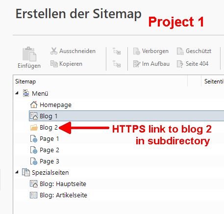 Da es in der Vorschau keine sichtbares Menü gibt, ist es am Einfachsten, wenn das 2. Projekt mit dem 2.Blog im Unterverzeichnis ist und nur die Blogs über Buttons per HTTPS-Adressen verlinkt werden.