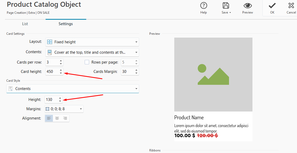 vennligst sørg for å justere innstillingene for Produktkatalog-objektet slik at Innhold-delen har tilstrekkelig høyde tilgjengelig til å vise alt fullstendig.