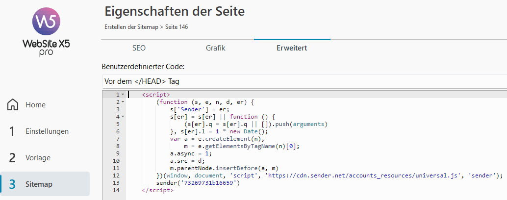 In WebsiteX5, under "3 Sitemap", mark the page where the pop up should appear and then click on "Expert" or "Properties" (depending on the language version) at the top and insert the code before the closing </HEAD> tag, see (2) (German version)