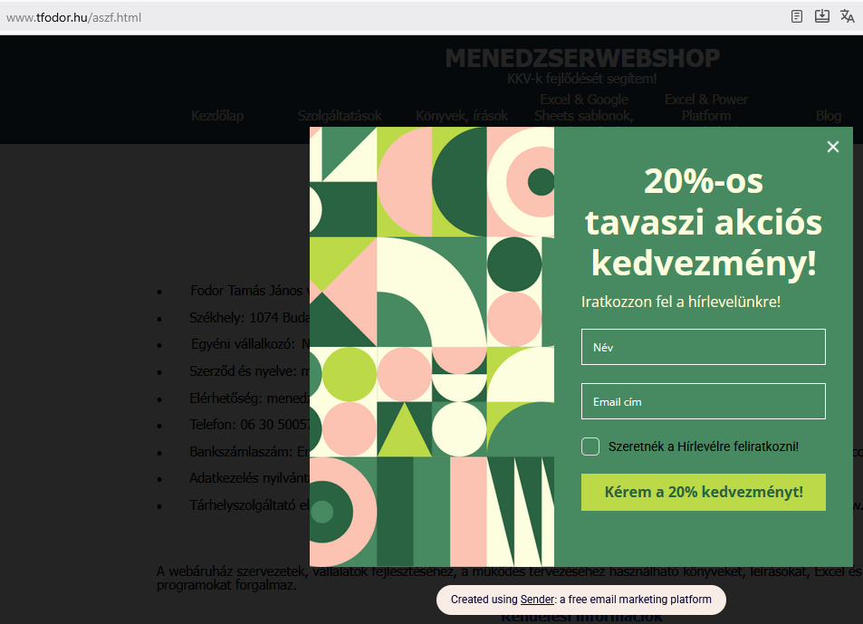 I placed a pop-up window on the https://www.tfodor.hu/aszf.html page. The script is right before the closing </head> tag. The pop-up form from Sender.net. Unfortunately, it does not work. What could be the problem?