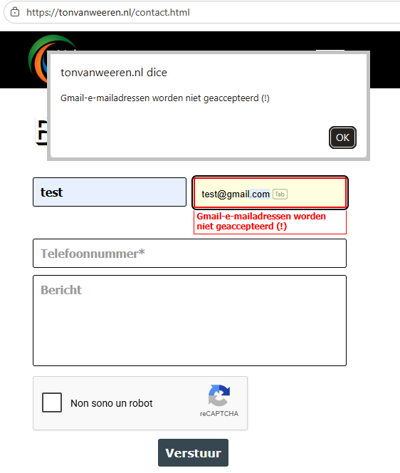 Author: Ton Van WeerenHallo beste lezer, ik heb een vraag ik zou graag willen weten of het mogelijk is om in je e-mailfotmulier een bericht te plaatsen dat als je een gmail.com adres hebt dat deze wordt gewijgerd met een melding aan de verzender voordat deze wordt verstuurd. Ik kan nu wel via mijn provider alle commerciele gratis e-mailadresen weigeren maar ik zou het wel beleeft vinden om dit ook automatisch aan te geven als je het e-mailadres invult dat deze niet wordt geaccepteerd. Ik hoor graag of hier moeglijkheden voor zijn in het formulier. Alvast bedankt voor de reactie's Groetjes Ton.