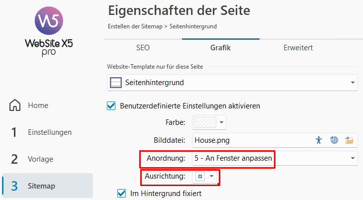 In WebSite X5, under "3 Sitemap," select the page and click "Properties" at the top, then click "Graphics," and under "Arrangement," select "5 - Fit to Window," and possibly also center under "Alignment."