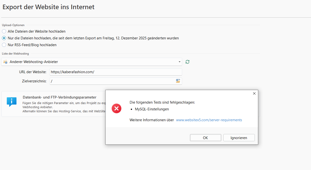 Die Angaben für die Datenbank sollten sich im Kundenbereich des Webhosters finden lassen, diese auf einem Zettel notieren und mit den Angaben in WebSite X5 vergleichen.
