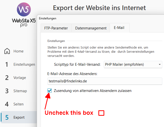 Normally, to send emails with WebSite X5, a domain email address would need to be entered in the email parameters, and then the emails would need to be forwarded to the Yahoo Mail address by the web host.