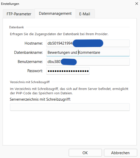 the Datenbankname field should contain the name of the database, and not the function for which you would like to use it, so please go ahead and replace Bewertungen and Kommentare with the actual database name (which you may currently have added to the Hostname field, which usually contains either localhost or an IP address, though some hosting configuration do have a different format).