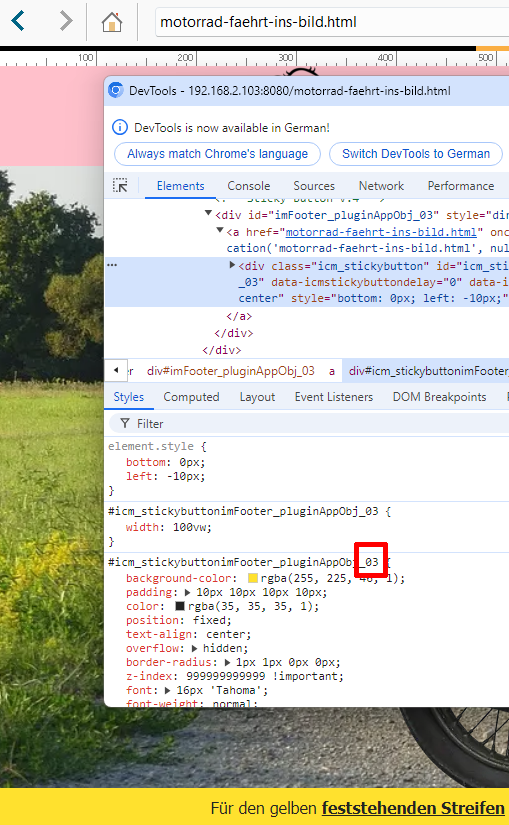 Der gelbe Streifen ist verlinkt zu einer Seite, bei der ein Motorrad ins Bild fährt.