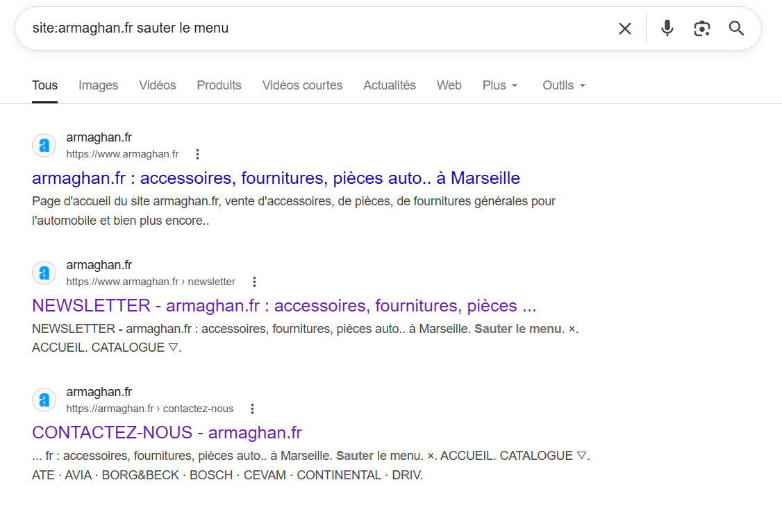 Tapez simplement 'site:armaghan.fr sauter le menu' et voyez déjà dans la liste des résultats de la recherche obtenue certaines pages concernées.