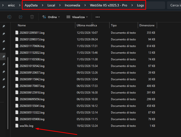 como ya te he dicho, por favor ve en tu ordenador a la carpeta C:\Users\TuUsuario\AppData\Local\Incomedia\WebSite X5 v2025.3 - Pro\Logs y deberías encontrar un archivo llamado wsx5lic.log. Por favor envíamelo a support @ incomedia.eu (sin espacios).