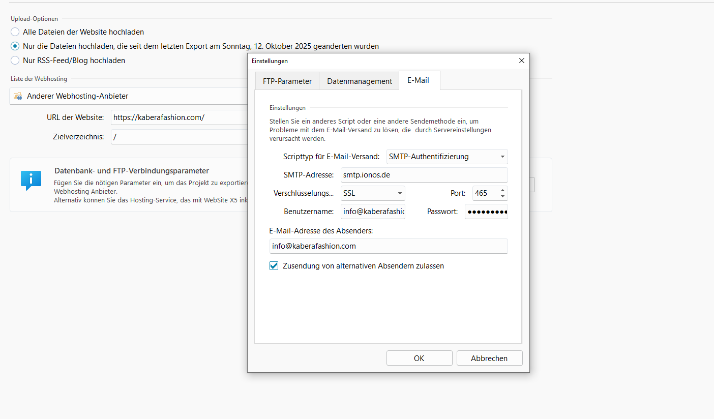 ergänzend zu dem, was Andreas und Daniel erwähnt haben, könnten Sie bitte einen Screenshot Ihrer E-Mail-Einstellungen in Schritt 5 – Exportieren → Ins Internet hochladen → Parameter bereitstellen?