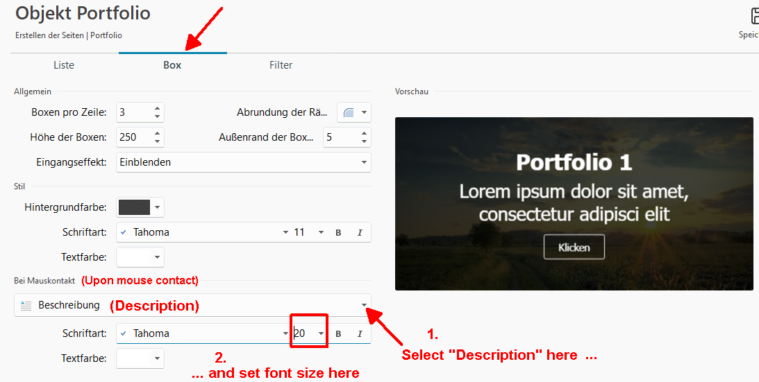 In the object portfolio, click on the "Box" tab and select "Description" under "Mouse Contact" at the bottom. Here, you can select the font size, font type, and font color.