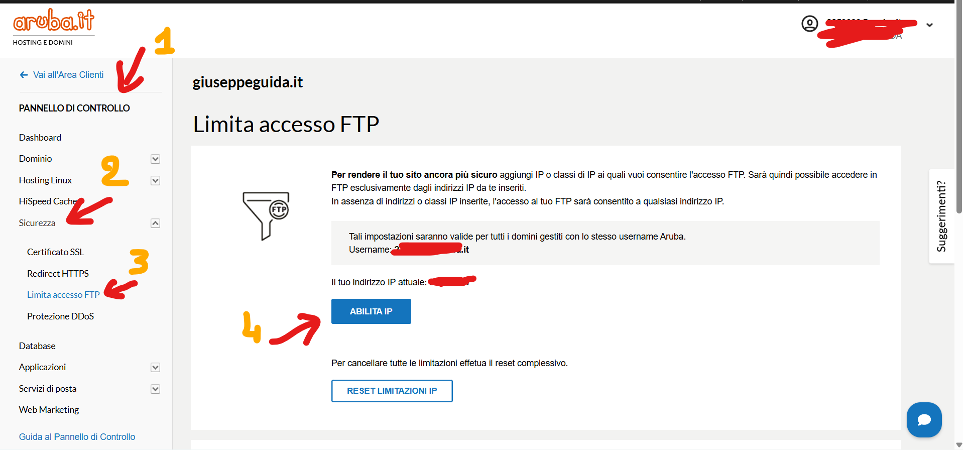 Se i parametri siete certi che siano corretti e se siete su ARUBA, controllate l'abilitazione dell'IP come ho indicato nello screenshot sopra. Quell'errore lo dà o con parametri non corretti o perchè il vostro IP non è abilitato a pubblicare. Va abilitato su ARUBA o eventuale altro provider che ha i filtri sugli indirizzi IP.