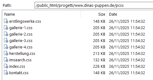 Wie hier besprochen, schickte ich einen Link von einem Ordner, in dem meine beiden Projekte enthalten sind. Es betrifft die Dateien, die jeweils im PCSS-Ordner enthalten sind. Lokal im jeweiligen Upload-Ordner sind die CSS-Dateien wunderbar (da nehme ich sie auch für die manuelle ftp-Übertragung), aber auf der Webserver-Seite kommen häufig 0 KB große css-Dateien an. Auch bei Anzahl gleichzeitiger Übertragungen = 1 tritt das Problem auf. Ich habe zwei Projekte gespeichert, weil dieses Problem bei beiden Projekten auftritt. LG, Johannes