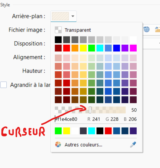 - Pourquoi le curseur d'opacité de couleur n'est toujours pas présent dans tous les réglages graphiques de couleurs du logiciel? Il est disponible par exemple pour l'arrière plan dans Barre Sticky mais il ne l'est pas pour tous les réglages d'en-tête, de page, de pieds de page, d'arriére-plan d'en-tête, d'arrière-plan de page et d'arrière-plan de pieds de page dans Structure du modèle > Paramètres du Modèle comme il ne l'est pas non plus dans le réglage graphique de couleur des Paramètres personnalisés des Propriétés des pages. Intégrer le curseur d'opacité de couleur dans tous les réglages graphiques de couleurs du logiciel simplifierait la configuration du projet et éviterait de devoir aller faire le réglage d'opacité de couleur dans les fichiers CSS minifiés publiés sur le serveur en ligne.