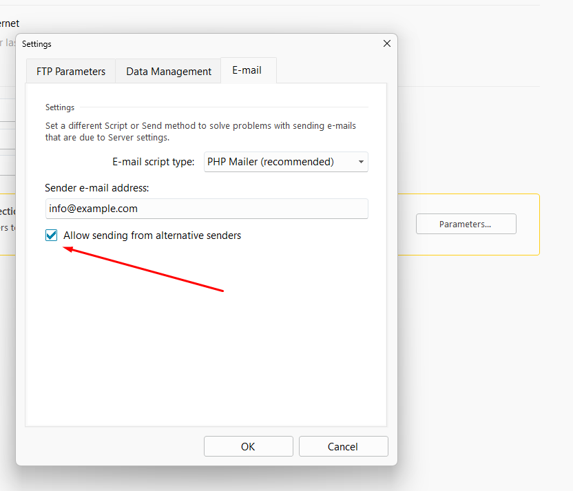 If you go to the E-mail settings in the Parameters section found in Step 5 - Export, is the function "Allow sending from alternative senders enabled"?